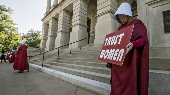 A protester dressed as a character from Hulu’s “The Handmaid’s Tale” outside the Georgia state Capitol